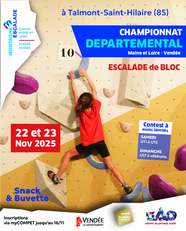 Le championnat départemental de bloc, organisé conjointement entre le 49 et le 85 et aura lieu le week-end du 22/11 et 23/11 dans notre salle de Talmont Saint Hilaire au 2 rue des Ribandeaux.