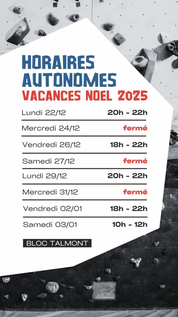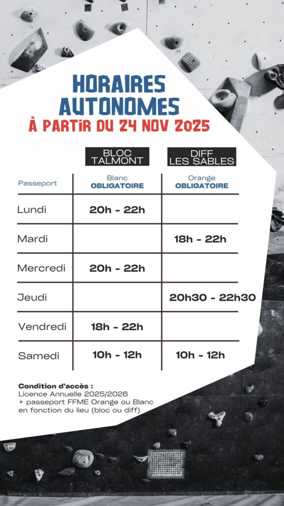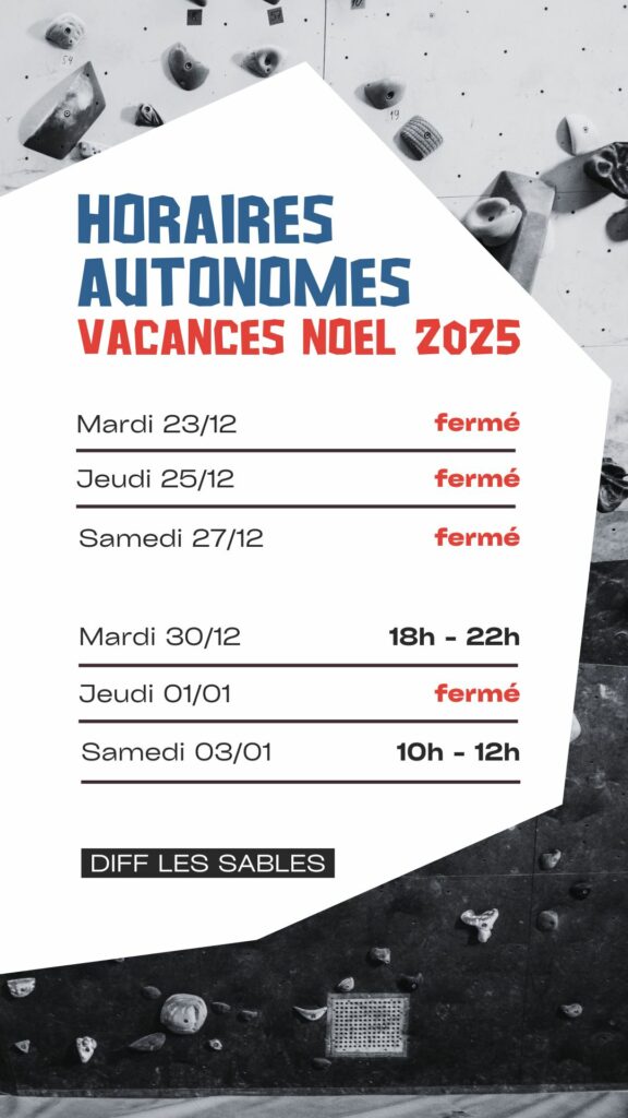 Ci-dessous, les horaires d’ouverture pour les grimpeurs AUTONOMES.